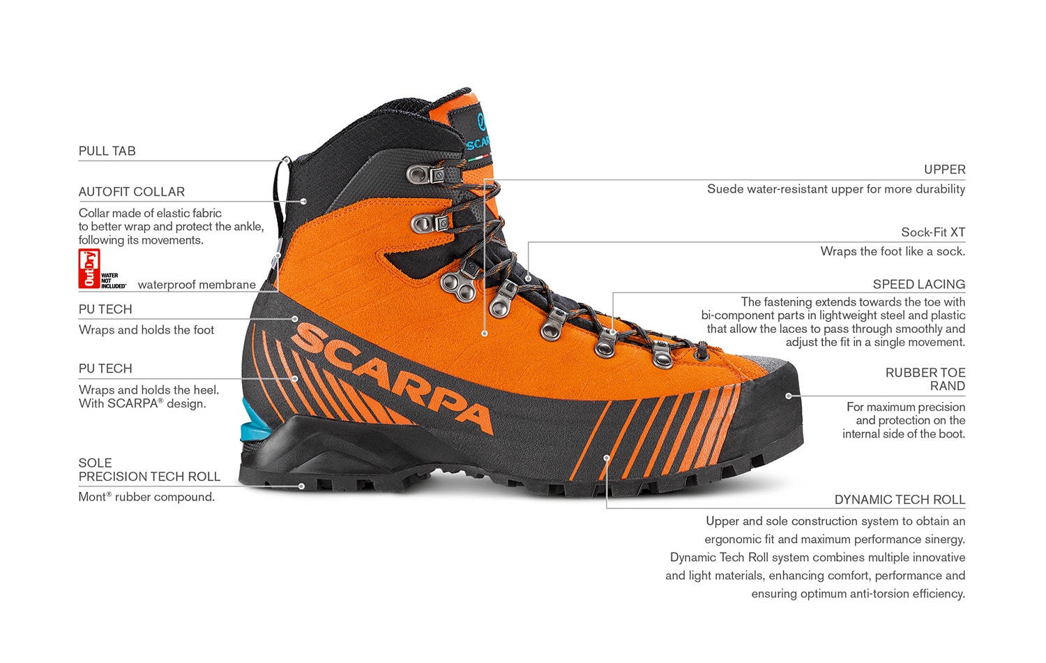 PODRÁŽKA Pentax Precision Roll Sole, vyvinutý společností SCARPA® a vyvinutý ve spolupráci s Vibram®: výsledkem je lehká, polstrovaná, technická podešev.