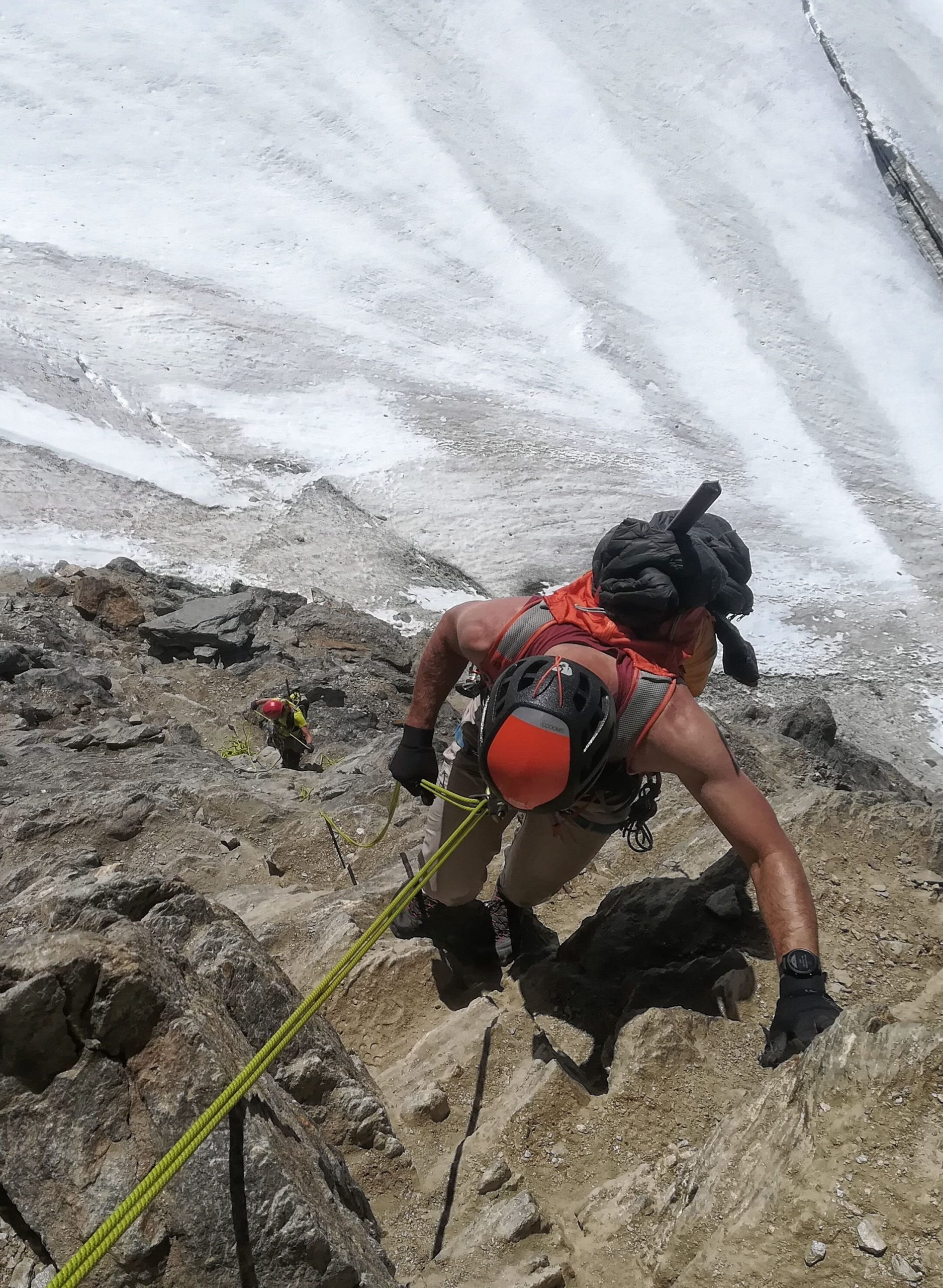Právě stojíme pod hřebínkem Festijoch a koumáme, kudy to do sedýlka bude nejlepší. Tak nějak se dá lehce přebuncat popolézáním po skále. Vzpomenu na Tatry. Z letargie mě probudí partáci, kteří vyžadují jištění a lano. Zmatek. Nějak jsem se nechala unést a už jsem dost vysoko. Slézám. Přebírám lano, chvilku čaruju s uzly, odsedkami, kyblíkem a fixními slaňáky, které jsme našli a nakonec se nahoru jakžtakž vyškrábeme. Ale zabralo nám to více času, než bychom chtěli. Dvojice, co šla za námi, to nějakým způsobem přetraverzila více doleva. Asi to znají. My jsme samozřejmě vylezli blbě a k cestičce ve sněhu musíme trochu sejít v nafoukaném sněhu. Shora se cestička v hřebínku hledá lépe. Zpět už to najdeme. Další postup tedy nevolíme skalním hřebenem přímo na vrchol, ale vezmeme to naokolo po ledovci Hohberggletscher. Přeci jen nás extempore na skalce znejistilo a ledovec bude jistota. Je to sice dál, ale…