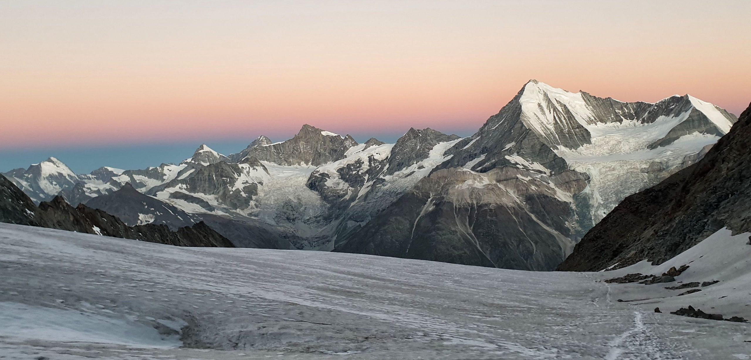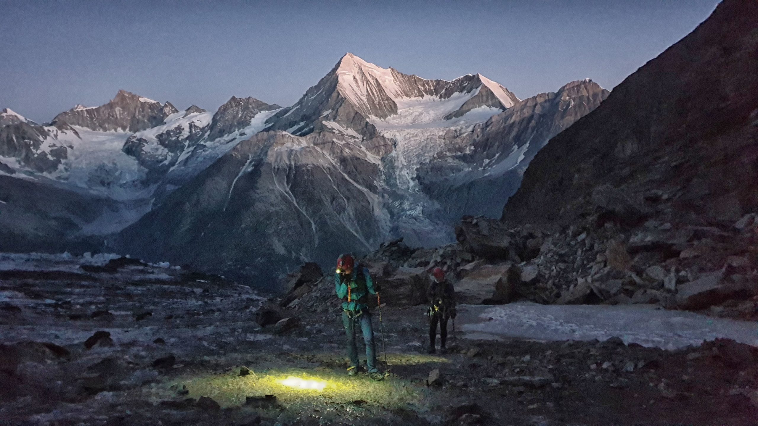 Po lehké snídani v odemčeném zázemí chaty pokračujeme už neznačenou výstupovou cestičkou podél ledovce. Značně přituhlo, jsem vděčná za péřovku i hůlky, neboť konec ledovce v podobě černého ledu je pokryt sutí a kamením. Jít tudy tak před měsícem, určitě by tu byl ještě sníh a výstup by byl hned příjemnější. Nastupující svítání odhaluje nádherné výhledy na protější vrcholky Weisshorn, Matterhorn a další jiné Horny, kde neznatelně poblikávají čelovky stoupajících horolezců. Wow! Před námi se nakonec také pár světélek objevuje právě na skalnatém hřebínku Festijoch. Takže přeci jen někdo další stoupá. Uf.