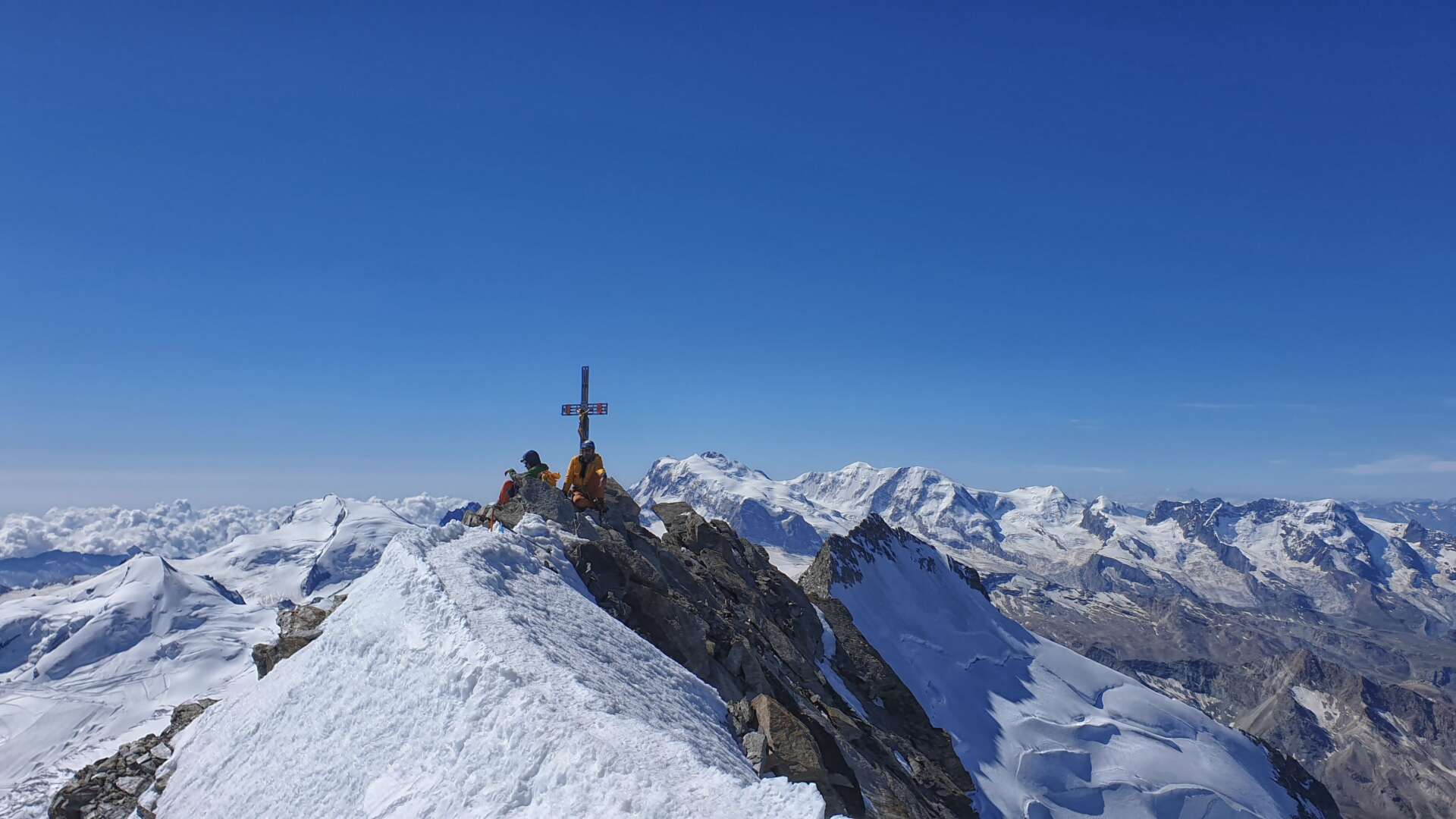 Konečně vrcholové plató. Sníh je tu dost přemrzlý, občas se mačka sveze, ale to není nic oproti tomu, co nás ještě čeká posledních pár desítek metrů. Jedna jediná trčící skalka na uzounké rampě pokrytá ledem. Tady nám zatuhne krev v žilách. Kdejaký znalý alpinista by to přeběh bez mrknutí oka, my tlačíme ledovcové šrouby a dojišťujeme se. V křeči se dokodrcám na něco, jako vrchol Dom des Mischabel. Je lehce kolem poledne.