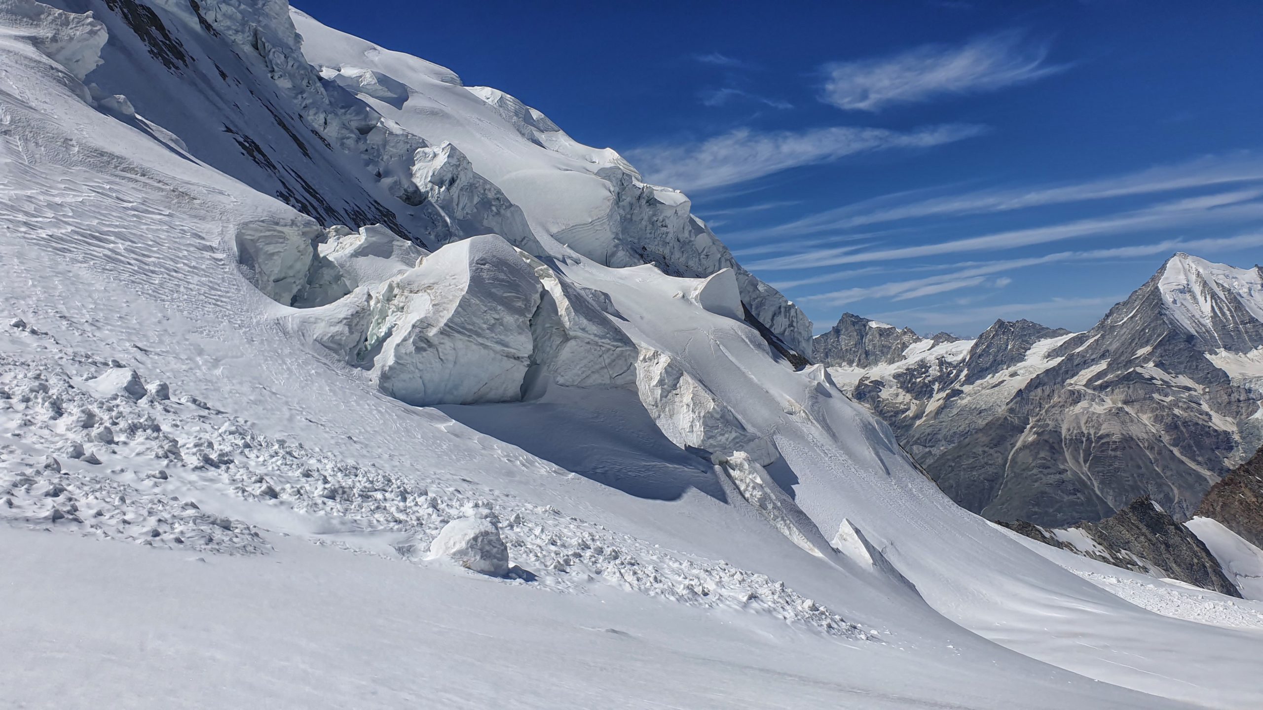 Po ledovci již naše trojice stoupá znatelně pomaleji a výstup se nekonečně táhne. Jednak už se blížíme hranici 4 tisíc metrů a taky nás pomalu ale jistě přepadá spánková únava. Suníčko už vykukuje zpoza vrcholků Nadelhorn 4.327 m a Lenzspitze 4.294 m. Pomalu sundáváme svršky a zmrzlý sníh lehce chřadne pod hřejivými paprsky slunce. Často zastavíme k odpočinku nebo menší svačině. Máme krásný výhled na vrcholový zasněžený masiv i odtrhy na jeho úpatí, vytvářející dechberoucí scenérii, která mi tak trochu připomíná rozsednutý šlehačkový dort.