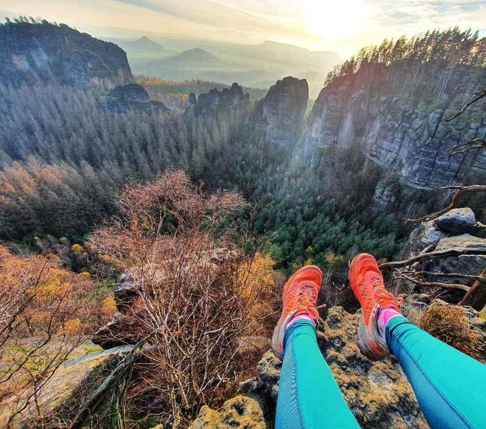 Vezmeme to rovnou na horolezecké chodníčky mimo oficiální trasy. Pěšinka je tu přehledná a některá místa u strmých srázů i zajištěná. Nacházíme spousty skalních převisů a bran, vrcholky pískovcových věží se schránkami na zápisy na dosah. Přímo při kouzelném západu slunce. Nakonec se napojujeme na původní žlutou trasu s Nebeským žebříkem a spokojeně můžeme seběhnout na parkoviště. Dnes to stálo za to!