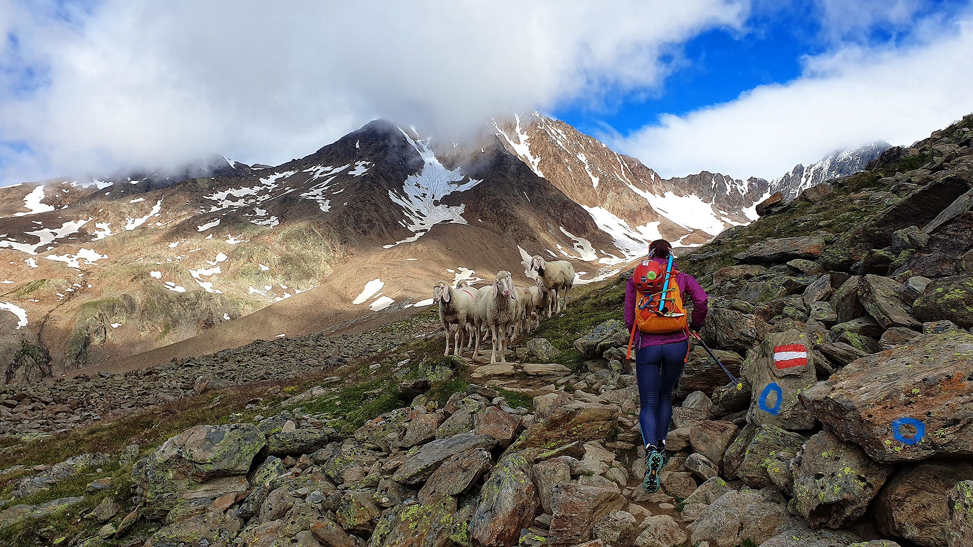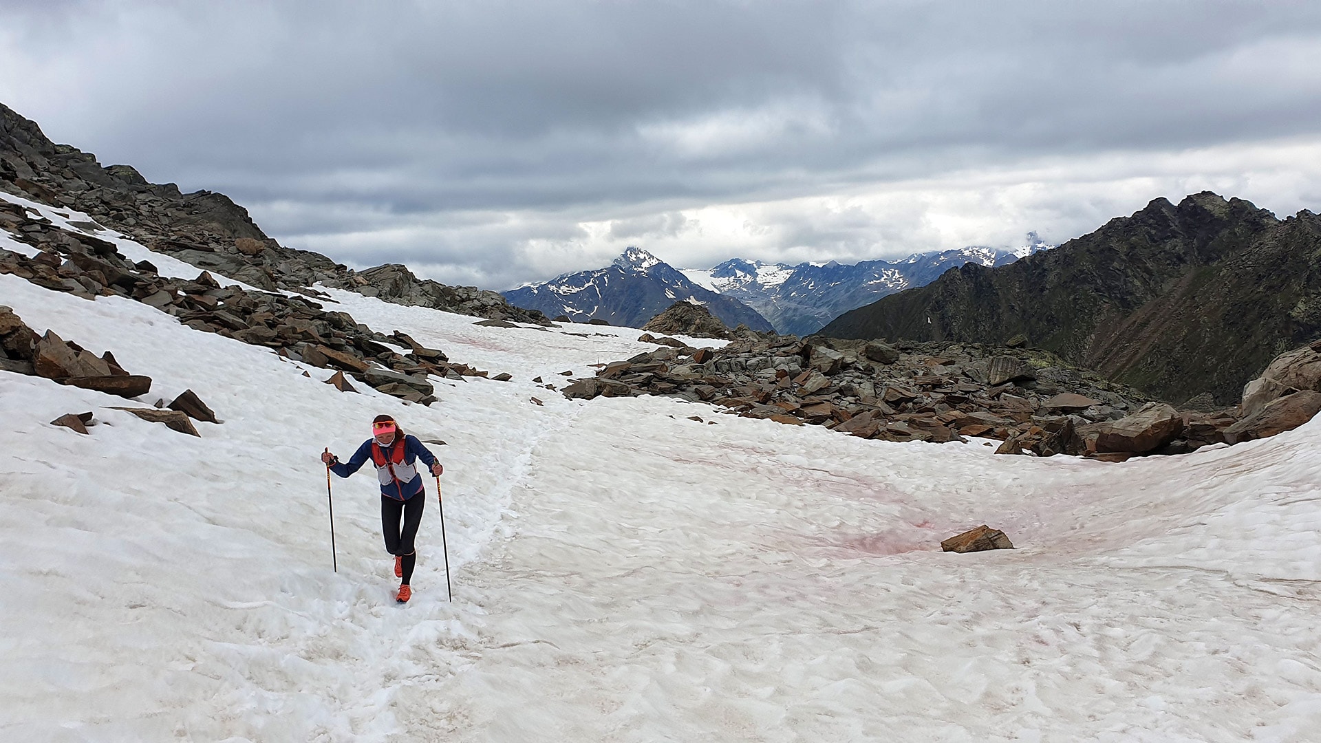 Jdeme tam poprvé, nevíme co čekat, ani kolik sněhu nahoře je. Hřebínky a vrcholy jsou dnes bohužel v mracích. Já balím pro jistotu běžecké nesmeky, membránovou bundu, půl litru vody, běžecké Leki hole a obutí Scarpa Spin Ultra. Musí to stačit. Po překlenutí pár úvodních sedýlek a cca 2.500 m.n.m. se dostáváme do vysokohorského “vnitrozemí” se spoustou sněhu i převalující mlhy. Nesmeky není potřeba vytáhnout, skály mezi sedýlky nekloužou a jediné, co mně na tůře chybí, jsou rukavice. Ruce mrznou. Po dobytí zápraží chaty i jejího vrcholku Hoher nebelkogel volíme v neustupujících se mračnech raději sestup do vedlejšího údolí stezkou Himmelsleiter, kterým se pozdější traverzou napojíme na naši výchozí trasu zpět do Söldenu.