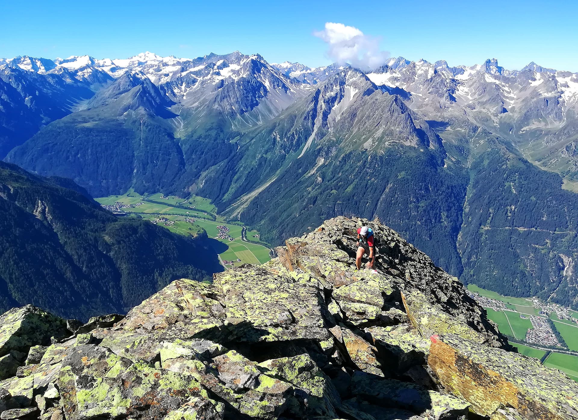 Nedělní ráno vstáváme odpočatí poměrně brzy a tak v 7 hodin už stepujeme u zaparkovaného auta nad městečkem Längenfeld. Je jasný teplý den a nás čeká rychlovka na závěr, vrcholek Hörndle. Náhodně vybrán večerní loterií nad mapou.