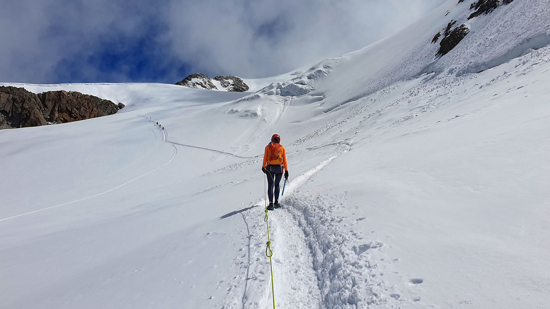 V podstatě až po skalní feratu mimořádně vysněženého žlabu zanikajícího ledovce Mitterkarferner, stoupáme už v mačkách sami. Na feratě se vyhýbáme několika již navracejícím se družstvům s horskými gajdy. Po peřklenutí sedýlka Mitterkarjoch už po ledovci Taschachferner stoupáme v podstatě úplně sami. Na tomto hřebenu se mraky lámou.