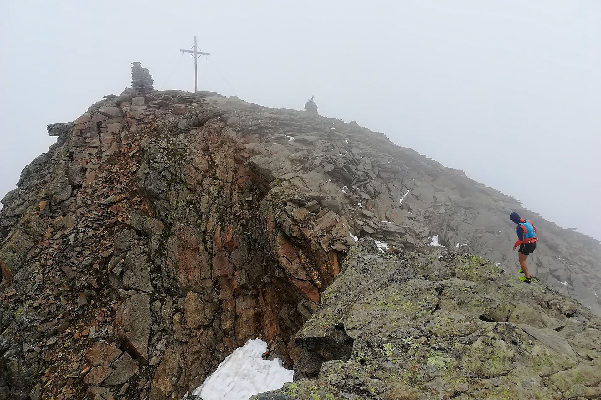 Skalnatá vrcholová část je krásně vysněžená a na mačkách hodinu po poledni dobýváme dnešní vrchol prosvětlovaný mlhovinou zastřeným sluncem. Na vrcholu se scházíme se skupinkou 3 Rakušanů, kteří stoupali už před chatou s námi. Šli druhou stranou, po ledovci Rafenkarferner. Kratší, ale o poznání strmější výstupovou trasou.